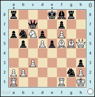 29.Le6! Schwarz steht auf verlorenem Posten. Es droht vor allem 30.Se7, wonach die Entscheidung auf dem neuralgischen Feld f7 fällt. Txg5 Sf4 30.Lxf4 exf4 31.Lxf7+! Dxf7 32.Tae1+ Kd7 33.Dxf7+. 30.Dxg5 fxe6 31.dxe6 1:0. Schwarz gab auf wegen Dxc6 32.f7 matt.
