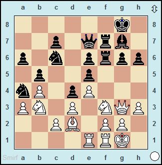 1.e4 e5 2.Sf3 Sc6 3.Lb5 a6 4.La4 Sf6 5.0–0 Le7 6.d3 b5 7.Lb3 0–0 8.Sc3 d6 9.a3 Sa5 10.La2 Le6 11.Lxe6 fxe6 12.b4 Sc6 13.Ld2 d5 14.Te1 Dd6 15.Sa2 Sd7 16.De2 d4 17.Teb1 Sb6 18.Sc1 Sa4 19.Sb3 Tf7 20.Tc1 Td8 Bisher ist nicht viel passiert. Beide Seiten lavierten harmlos, wobei die ausgeglichene Stellung für Schwarz optisch etwas besser gefällt. Der Turmzug nach d8 statt nach f8 deutet zumindest an, dass Schwarz sich auf der halboffenen f-Linie nicht viel ausrechnet. 21.Sg5!? Tf6?! Die erste Ungenauigkeit. Lxg5 22.Lxg5 Tdf8 23.Tf1 Sc3 24.Dg4 a5 überzeugt im Nachhinein mehr. In der Stellung bestimmt eher Schwarz das Gesetz des Handelns. 22.Dh5 h6 23.Sf3 Tdf8 24.Tf1 T8f7 25.Tae1 Lf8?! Ein unscheinbarer Fehler. Programme halten den Zug für schwach und plädieren für Tf8. 26.h3! Dieser feine Zug plant die Springerüberführung via h2 nach g4 und zeigt das Problem mit dem Läuferzug nach f8 auf: Die schwarzen Türme stehen unglücklich. Vor allem der auf f6 kann in die Bredouille geraten. g6 27.Dh4 De7 Le7! ist etwas nachhaltiger. Nun droht Txf3 mit Läuferangriff auf die Dame. 28.Dg4 (28.Dxh6? verbietet sich wegen Th7 29.Dg5 Txf3 30.Dxg6+ Tg7 31.Dh5 Tff7 und Schwarz hat eine Figur für zwei Bauern erobert.) Kh7 Caruana steht zwar etwas besser, aber der Vorteil bleibt minimal. 28.Dg3 Lg7