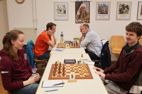 Hartmut Metz, der nominell den größten Vorteil am siebten Brett mit 237 DWZ besaß, konnte derweil unter den Augen des extra angereisten Edelfans Ralf Gantner nicht viel mit Weiß herausholen. Konstantin Miller behandelte die Fantasy-Variante im Caro-Kann präzise. Nach einer Ungenauigkeit hoffte Metz im Springer-Endspiel auf mehr. Doch ein Bauerngewinn entpuppte sich umgehend als Remis-Abwicklung. Mehr Glück hatte Klumpp: Benjamin Hördt verlor bei der gegnerischen Zeitnot die Übersicht. So konnte der Kuppenheimer Material einsammeln und den Ausgleich herstellen.
