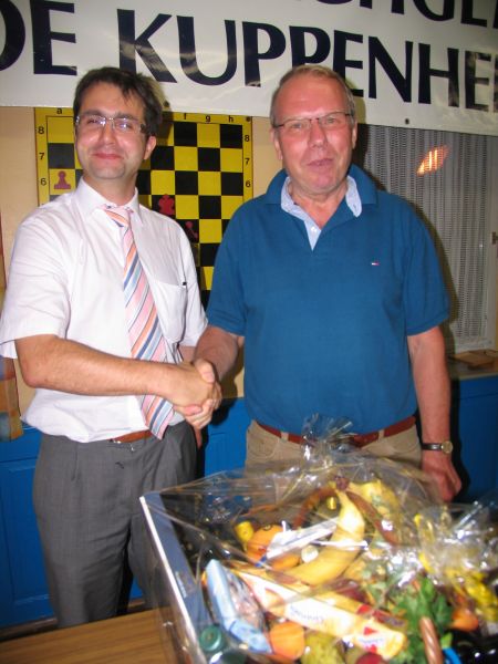 Heribert Urban (links) bekam von Präsident Fritz Meyer die goldene Ehrennadel des Badischen Schachverbandes verliehen.