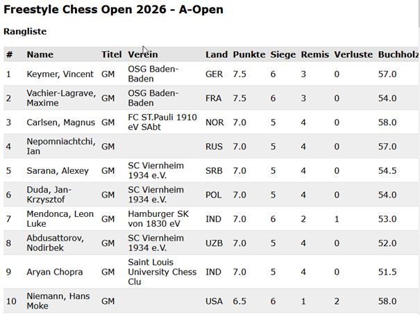 Über Ostern fanden in Karlsruhe das Grenke Chess und Freestyle Chess Open statt, wobei das Freestyle Open deutlich besser besetzt war, was man schon an den Namen der 10 Bestplatzierten des Freestyle Opens sieht: